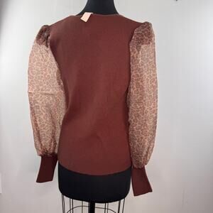 Anthropologie Dolan Brown Sweater Leopard Sweetheart Sheer Puff Sleeve Large NEW