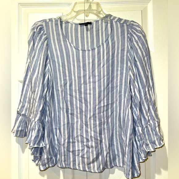 Anthropologie DREW Stripe Tiered Bell/Flutter Sleeves Blouse Women's Size M Blue