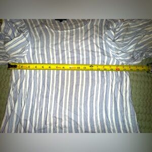 Elevate your wardrobe with this stylish striped blue and white top. Perfect for any occasion, this top offers both comfort and elegance.