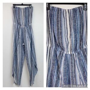 Anthropologie DREW natural linen with rayon blend, very lightweight, the Emerson blue, black, gray striped strapless pull on split leg jumpsuit.