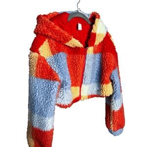 Anthropologie Daily Practice Faux Shearling Crop Zip-Up Jacket Orange Plaid XS