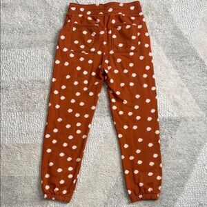 These stylish women’s joggers feature a playful polka dot design in rust and white. Perfect for everyday wear, they offer comfort and a trendy look.
