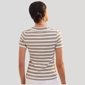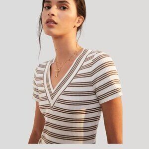 Anthropologie Daily Practice V-Neck Top White Brown Stripe Ribbed