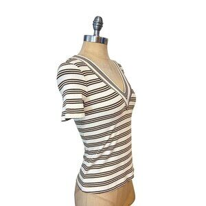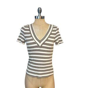 Anthropologie Daily Practice V-Neck Top White Brown Stripe Ribbed Size Small