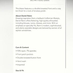 This blazer features a a double-breasted front and a cozy knit finish for a look of timeless polish. **About Daniel Rainn** Drawing inspiration from a laidback Californian lifestyle, Daniel Rainn offers flattering, high-quality silhouettes including blouses, tunics, dresses, and more. With an emphasis on specialty fits, Rainn's modern, sophisticated, and utterly wearable designs are beloved by women of all stylistic sensibilities.