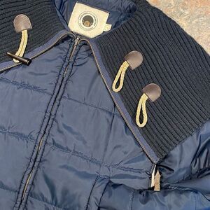 This is a navy blue puffer coat with a ribbed cape with toggle closures. It’s adorable and very stylish! Front pockets. No issues. Measurements in photos.