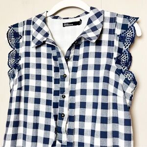 Anthropologie Dear Creatures Trinette Dress XS navy gingham shift ruffle eyelet mini classic preppy feminine popover cottagecore