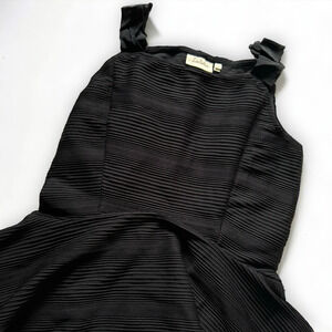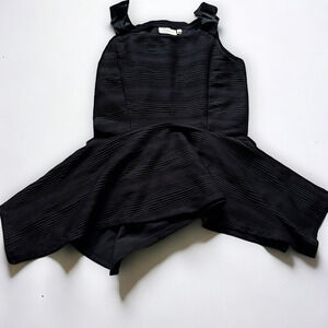 Classy black textured asymmetrical hem peplum top by Deletta (Anthropologie brand). Thick material with a horizontal line textured design, and thick shoulder straps. Perfect with a pencil skirt to finish a classic look.
