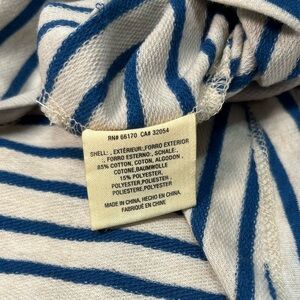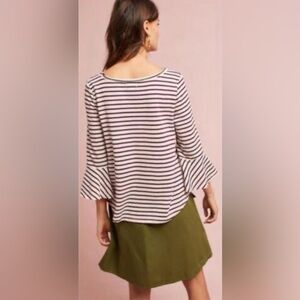 👉🏻 The top has a round neckline, long sleeves with bell cuffs, and horizontal stripes. It’s blue and ivory striped.