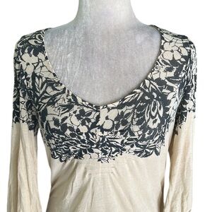 Anthropologie Deletta Cream Black Floral Print 3/4 Puff Sleeve Scoop Neck Tee XS