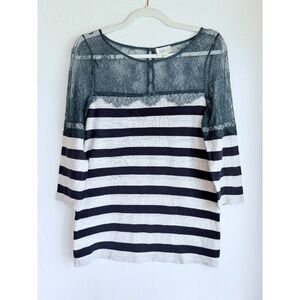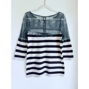 Anthropologie Deletta Lace & Lines 3/4 Sleeve Pullover in Teal, Navy & White M