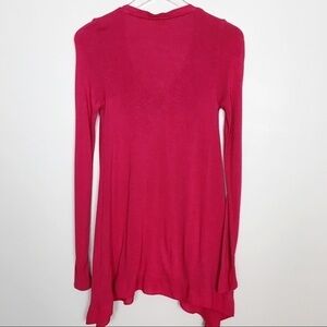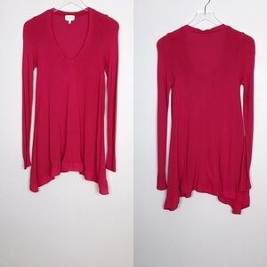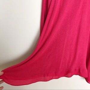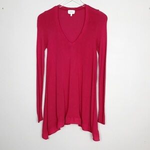 Anthro | Deletta Lokka tunic top with chiffon around the neck and hem. Very swingy top with V-neck, hem is longer at the sides than the center. Pretty red/pink color. Good pre-owned condition, some light pilling. Size S.