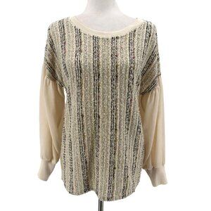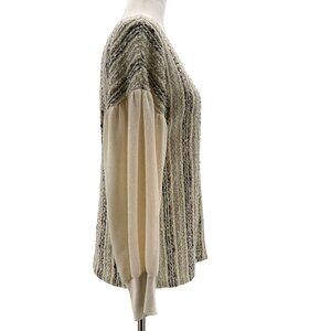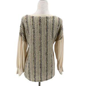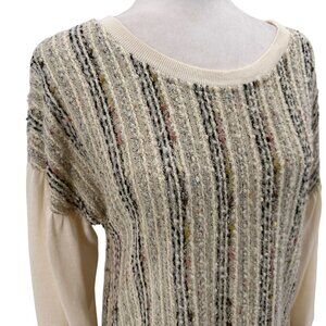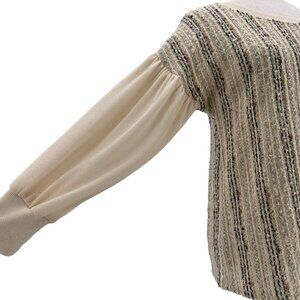 Anthropologie Deletta Textured Knit Cream Sweater Women's Size Small - Long sleeve pullover knit sweater- body is a gray & multicolor textured knit fabric. Sleeves are a light weight off-white / cream/ ivory lightweight knit fabric. Long balloon sleeves. Material has a stretch. Self: 70% Acrylic, 10% Wool & 10% Cotton. Contrast: Polyester & Rayon Blend. Hippie, boho, bohemian