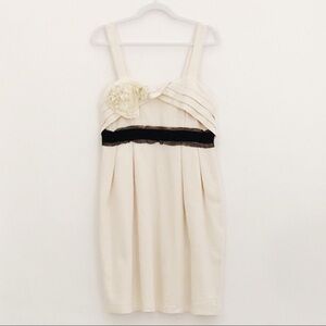 Empire Waist dress. Waffle knit - vanilla / cream color with attached black ribbon waist line. Frothy corsage. Pleated upper bodice. Lined. Excellent condition.