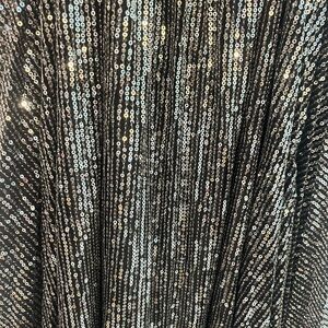 Top is a stretchy white more structured thick fabric, bottom is a flowy pleated silver sequin skirt