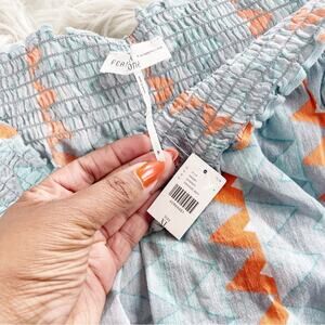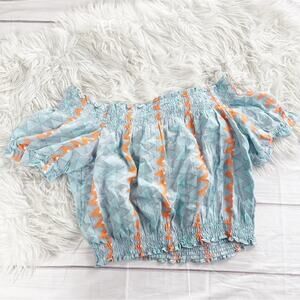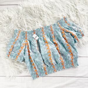 Boho and festival ready. Feather Bone Demetria crop blouse. Has elasticized shoulders, sleeves and midriff. Cute teal and coral geometric pattern.
