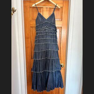 Stylish denim maxi dress. Features layered ruffles. Spaghetti straps for a chic look.