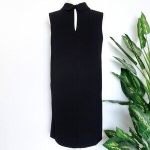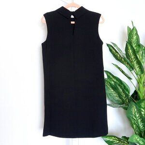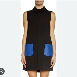 Simple lines and eye-catching accents characterize this gorgeous sleeveless shift dress from Dina Agam (Anthropologie). Crafted from black crepe fabric it features royal blue genuine lambskin patch pockets, a mock neck, and a button-fastening keyhole at the back. Great for work, parties, and so much more.
