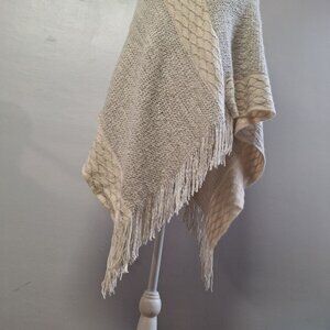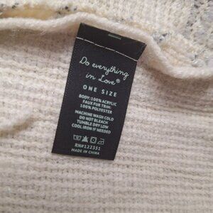 A chic and stylish Anthropologie Do Everything In Love poncho. Designed for a one size fit, it features a faux fur collar and a knit fringe that adds an extra touch of elegance.
