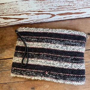 Soft boucle is woven through with sequin and metallic stripes to add a fun and modern touch to a classic wrist clutch. - Single top wrist strap - Zip top closure - Exterior features boucle and sequin construction - Interior features 2 slip pockets - Approx. 9.5" H x 13" W x 0.5" D - Approx. 7.5" strap drop