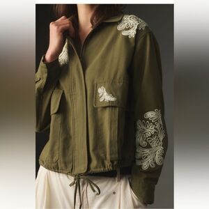 Keywords; Anthropologie jacket, women’s utility jacket, olive green jacket, embroidered jacket, cotton cargo jacket, military field jacket, zip front, long sleeve, boho chic outerwear, casual lightweight jacket, fall fashion, safari jacket, festival coat,
