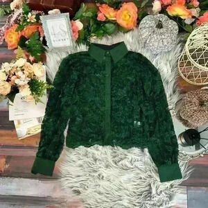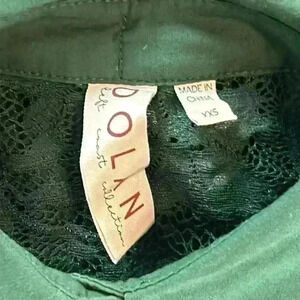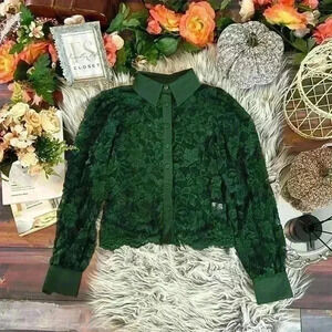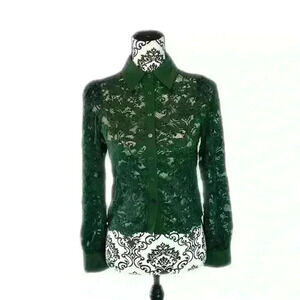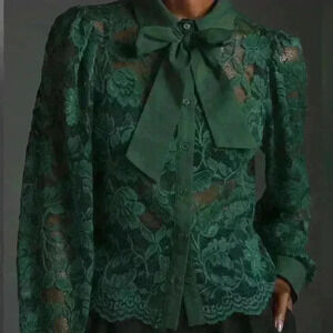 Anthropologie Dolan Forest Green Lace Button Down Bow Sheer Blouse