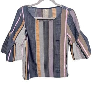 Anthropologie Dolan Left Coast Stripe Jacquard Top Size Small - Bold stripe. Boxy styling. 3/4 sleeve with Ruffle. Pullover styling - blue purple