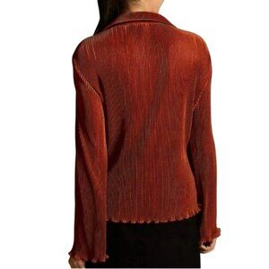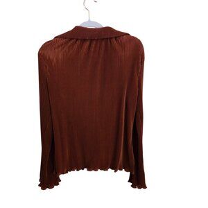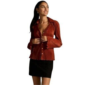 Elevate your wardrobe with this stunning rust-colored blouse featuring a lettuce hem, micro pleats, and bell sleeves. Perfect for any season, this button-down top offers both style and comfort. Retail $78