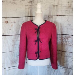 Pink with navy blue trim linen blend quilted jacket with bows along the front and front hook closures. Lined.
