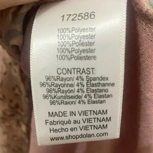Trendy and cute leopard print blouse. Silky muted pink and grey pattern. Long sleeves with elastic cuffs. Split V neck with tie closure. Stretchy rayon back panel. Subtle ruffle detail to front.