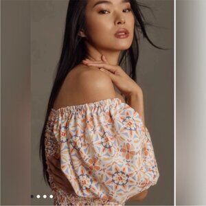 Charming smocked fabric with a floral design. Features pastel shades of pink, orange, and blue. Anthropologie Dolan Orange Motif Off-Shoulder Textured Top Size Large