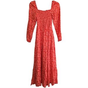 Anthropologie Dolan Smocked Red Motif Maxi Dress XS Pink Floral Long Sleeves