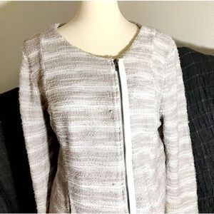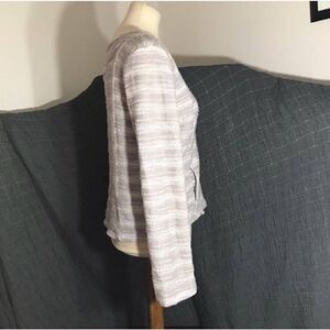 Gray & White striped lightweight sweater jacket. Front off centered zipper closure. Two front pockets. Pre-owned in good condition. Please refer to pictures for best description and condition verification.