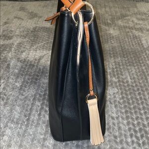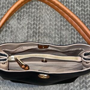 This elegant handbag features a sleek black design with stylish tan accents. Perfect for any occasion, it combines fashion with functionality.