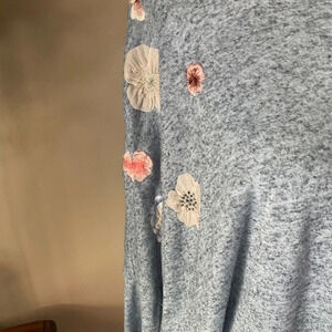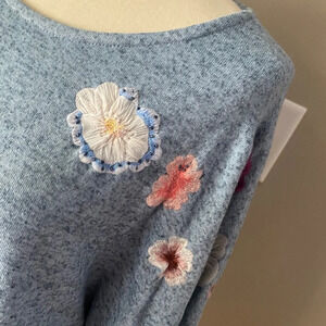 I purchased this item a few years ago at an Anthropologie sample sale. The tags were removed so do not know fabric content or size. It is a medium weight knit and fits like a small/medium. The embroidery is beautiful and the fit is very flattering.It is excellent condtion.