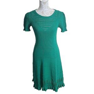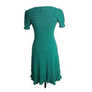 This Anthropologie dress by Maeve is a stunning addition to any wardrobe. The kelly green color is perfect for any season, and the pointelle knit fabric gives it a unique texture. The dress is a fit & flare style with short sleeves and a round neckline. It features crochet and ruffle accents that add a bohemian touch. The dress falls at knee-length and is designed for women's size small.
