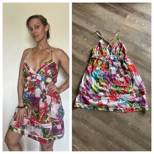 Anthropologie Festival Dress Embroidered Tropical Hawaiian Stretch XS Vacay Sexy