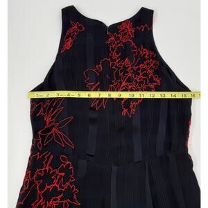 Features back zip closure and vibrant red embroidered floral details