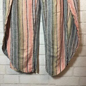 Anthropologie Drew Emerson Multicolor Striped Strapless Open Leg Linen Pastel Jumpsuit. Light and airy for warm, summery weather, Drew's Emerson strapless split leg jumpsuit arrives in the breathable comfort of a soft linen-rayon blend. Pre-owned condition, normal wear.