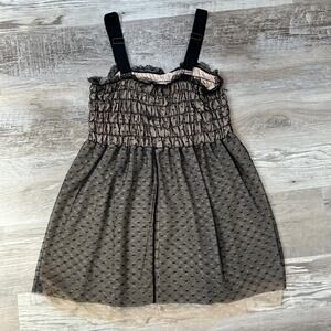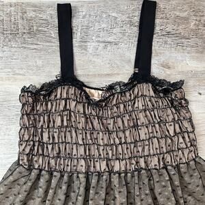 Romantic babydoll dress by Anthropologie’s E. Elouise line. Features a ruched mesh bodice, sheer dot tulle overlay, lace trim at bust, and nude lining. Adjustable straps. A dreamy, layered piece perfect for fairycore or soft grunge styling.