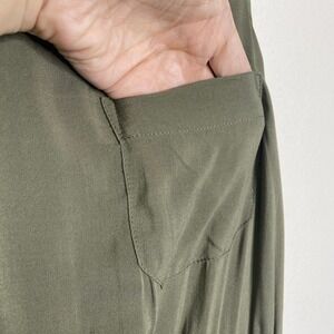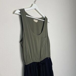 Fun dress by Edmy & Esyllte for Anthropologie. Olive green top and black bottom. Skirt has a curved hem and is lined. Two hip pockets and one chest pocket. Elastic waist with a drawstring closure for an adjustable fit. Super versatile! All measurements are approximate, taken flat and closed with the elastic at rest and NOT stretched.