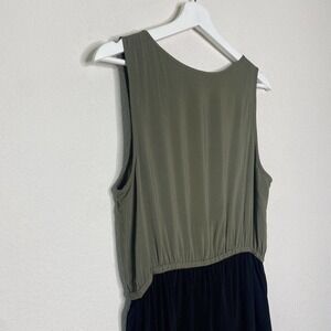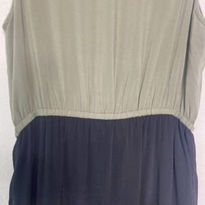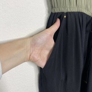 Fun dress by Edmy & Esyllte for Anthropologie. Olive green top and black bottom. Skirt has a curved hem and is lined. Two hip pockets and one chest pocket. Elastic waist with a drawstring closure for an adjustable fit. Super versatile! All measurements are approximate, taken flat and closed with the elastic at rest and NOT stretched.