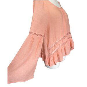 The Anthropologie E&M Round Neck Long Sleeve Lightweight Flowy Pullover Top in size Large is a stylish and versatile piece for women. Made from lightweight polyester material, this top features a solid peach color with lace accents, perfect for party or casual occasions. The round neckline, long sleeves with flare type, and pullover closure make it easy to wear and comfortable for all-day wear. The bohemian and peasant theme adds a trendy touch to your wardrobe, ideal for the summer, fall, and spring seasons.