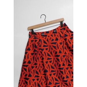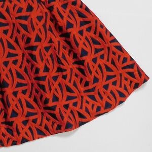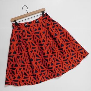 Defined waistband with two oversized decorative buttons on the front ~ Two inverted pleats on the front under the waist give the skirt a fullness ~ Two inset side/seam pockets ~ Slightly curved hemline ~ A-line silhouette ~ Concealed back zipper closure ~ Fully lined ~ Woven jacquard like fabric ~ Curved geometric pattern in red & navy blue