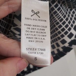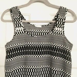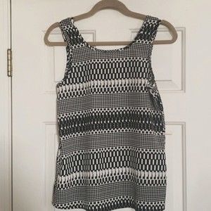 Sleeveless silky top in a Black White Geometric print by Anthropologie EVERLY. Scoop neck, loose, flowy top tank blouse with a black and white geometric pattern. Great for layering at the office or wear it on its own in the warmer months. Size SMALL Bust 34" Length 26" Excellent condition.