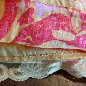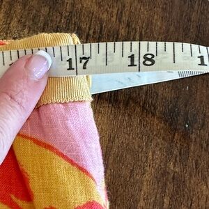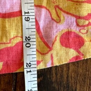 Very nice preowned condition, no flaws to note. Linen and cotton blend. Tropical floral, yellow, red and pink print. Fully lined. Darts on the front. Side zipper.