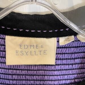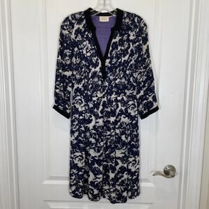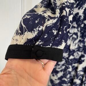 Navy blue, white and black Sketchbook Shirtdress by Edme & Esyllte, from Anthropologie. Features a smocked bodice, three-quarter length sleeves, an A-line silhouette, solid black contrast trim on collar and sleeve cuffs, and side slit pockets. Hits around knee length on most people. Excellent pre-owned condition. Bust across the front area (unstretched) measures approx. 16 inches (unstretched - stretches to several more due to the smocking). Length of the dress measures approx. 38 inches.