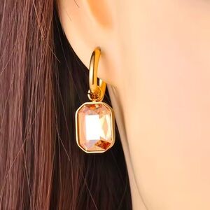 Stunning gold hoop earrings. Features a sparkling amber gemstone. Perfect for any occasion.