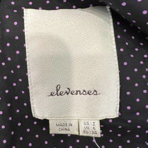 Elevenses Cold Shoulder Romper Ruffled cold shoulder romper in black by Anthropologie’s Elevenses. V-neck cut in front and back with cold shoulders and ruffled off shoulder sleeves. Pleated bottom with pockets on both sides. Back also has pockets. Zipper goes down back and hooks at top with hook. Lined with purple polka dots. 100% cotton