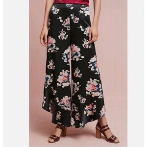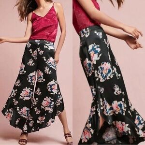 Anthropologie Elevenses Floral Tansy Ruffle Pants Black Satin Wide Leg